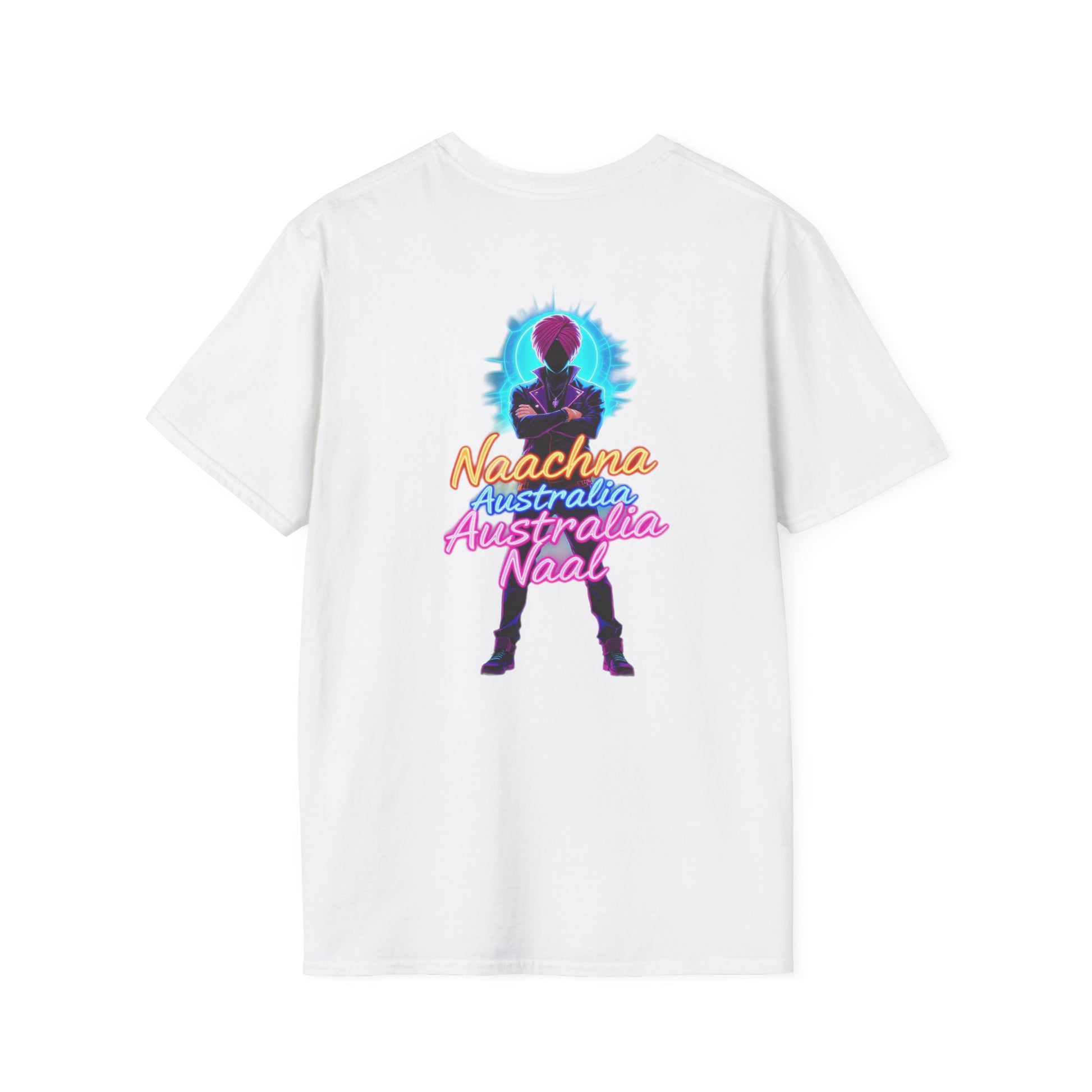 This T-Shirt features an Anime Punjabi character with a neon turban, stylish glasses, and holding a mic against a clean gradient abstract background, with bold glowing Punjabi font text “Naachna Australia Naal”. It gives off a vibrant and fun vibe, perfect for those who love fusion culture and anime. Ideal for Punjabi music enthusiasts or anyone looking to add a unique touch to their wardrobe. Relevant for cultural celebrations, music festivals, and casual wear.