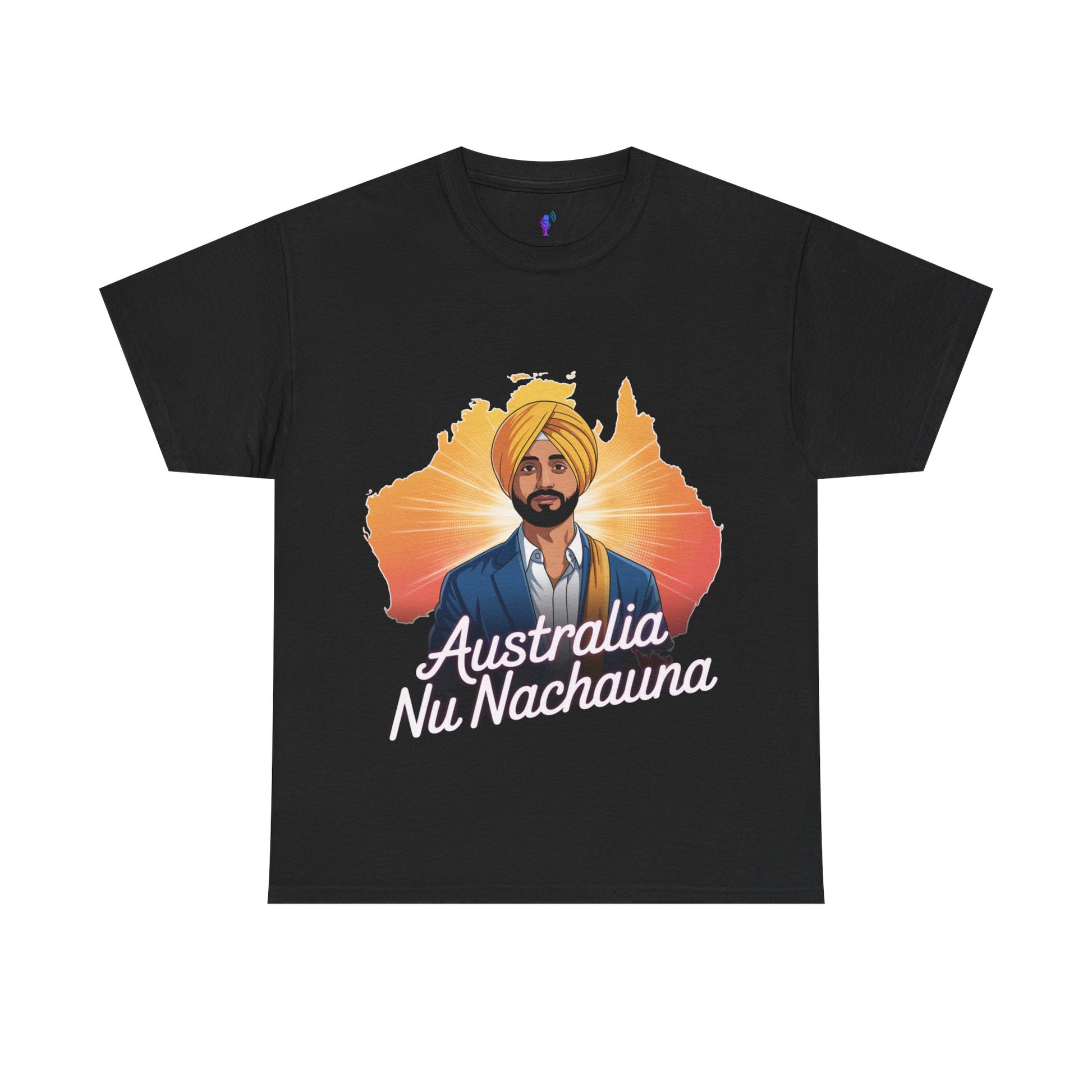 This Anime-style Punjabi singer themed T-Shirt features a singer with a turban aura against a glowing Australia map backdrop. The neon font text 'Australia Nu Nachauna' adds a vibrant touch to the design. Perfect for fans of Punjabi music and anime, this T-Shirt is ideal for casual wear or as a statement piece during cultural celebrations.